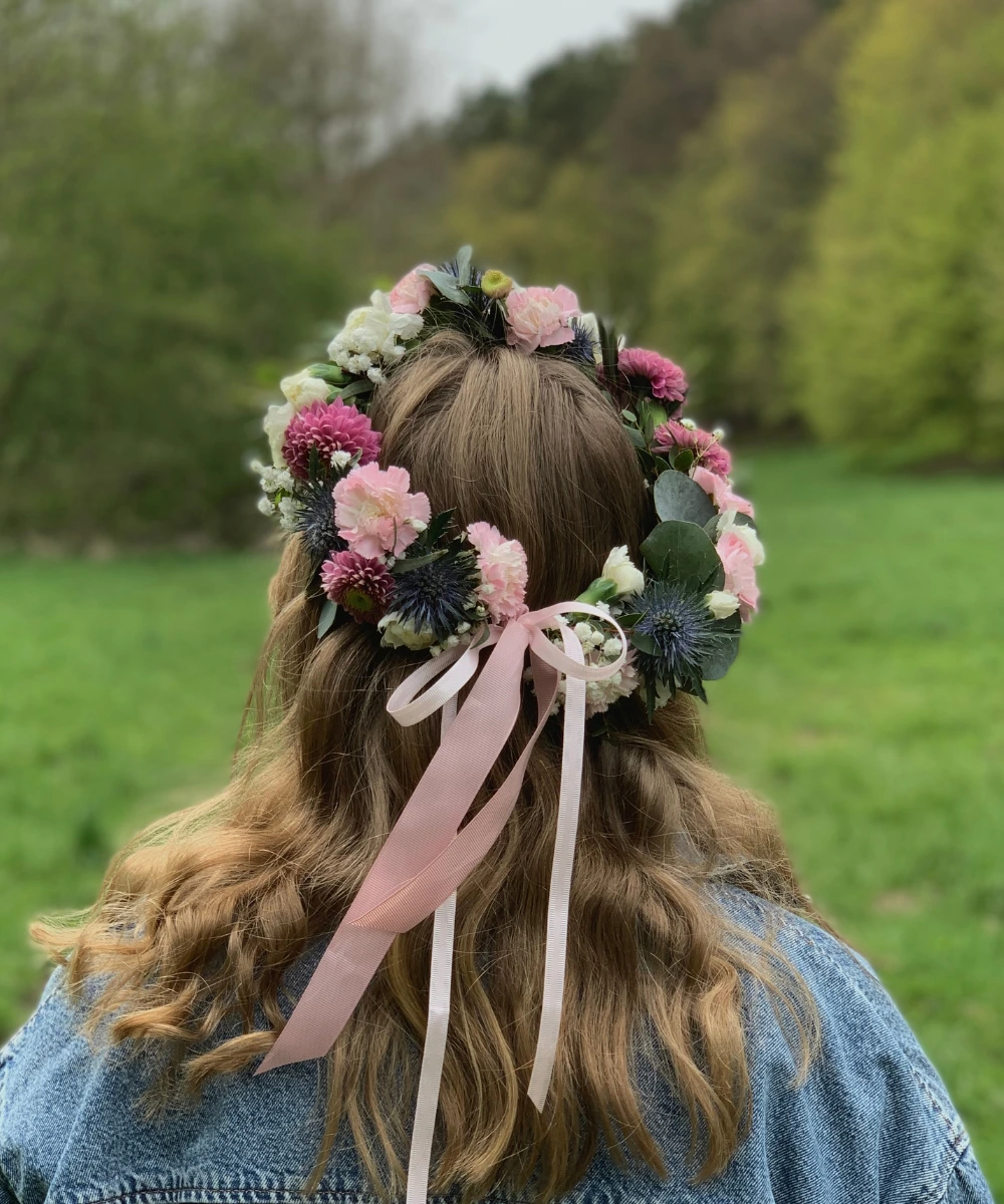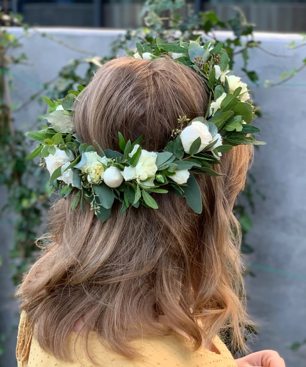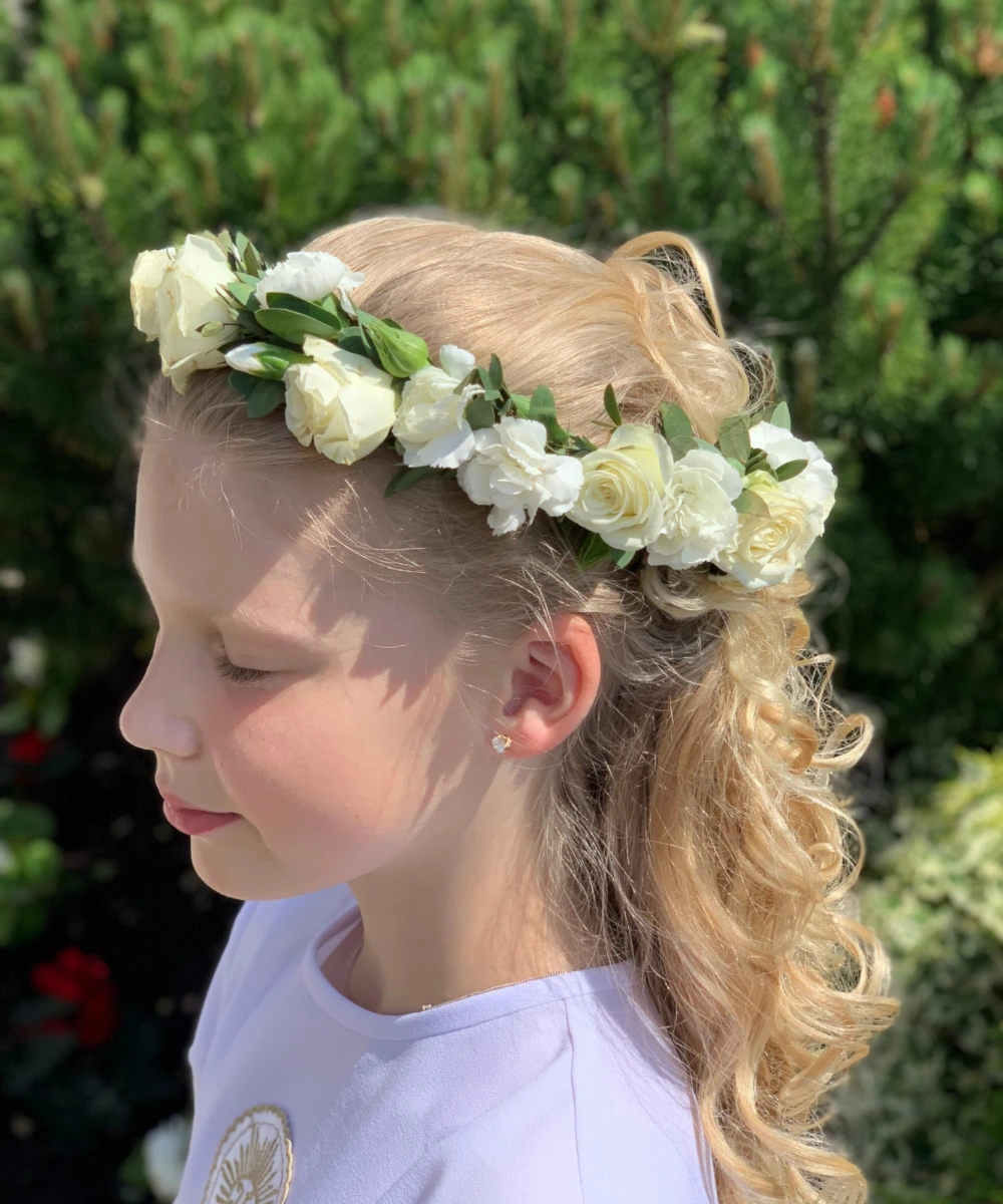 Ręcznie tworzone wianki na głowę ślubne i komunijne z naturalnych kwiatów, dopasowane do stylu uroczystości i fryzury.